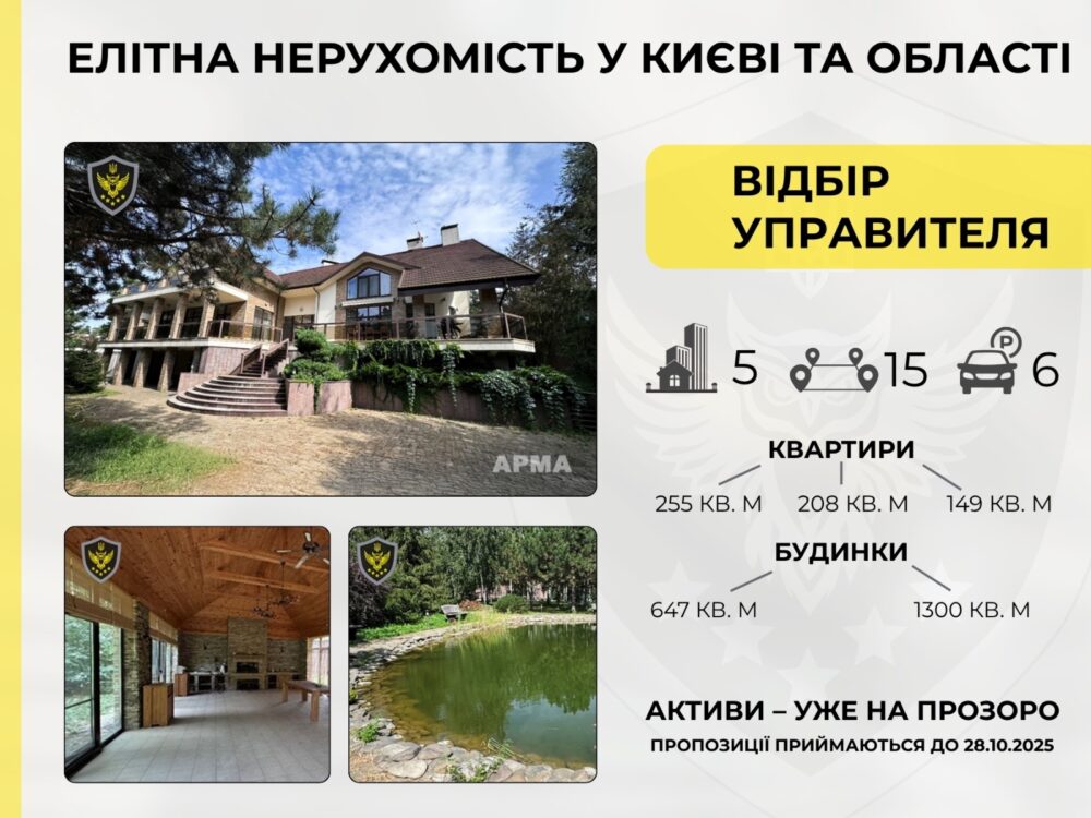 Агентство з розшуку та менеджменту активів (АРМА) оголосило на платформі Prozorro відкриті конкурси з відбору управителів для елітної нерухомості в Києві та Київській області. Активи були арештовані у межах кримінальних проваджень та передані в управління АРМА за рішеннями судів.